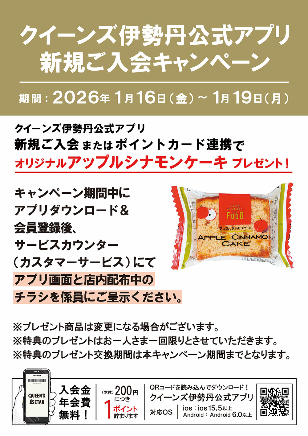 2026年1月16日(金)~1月19日(月)の期間、クイーンズ伊勢丹公式アプリ新規ご入会またはポイントカード連携いただいた方に「オリジナル アップルシナモンケーキ」をプレゼントいたします。
